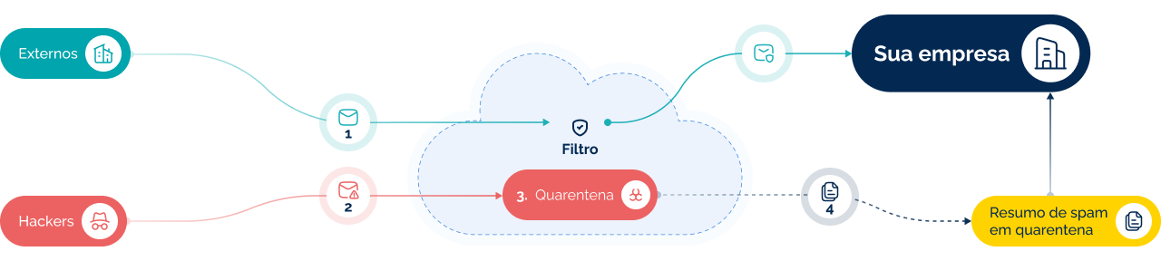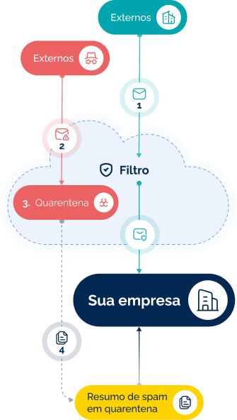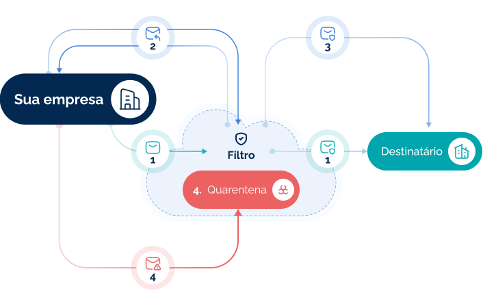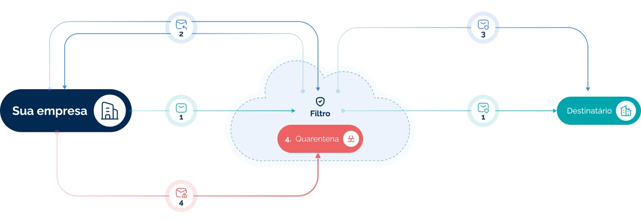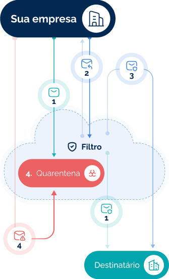 Ao identificar uma ameaça, o filtro bloqueia o e-mail e o envia para a quarentena, notificando a empresa sem permitir que a mensagem retorne ao ambiente interno.